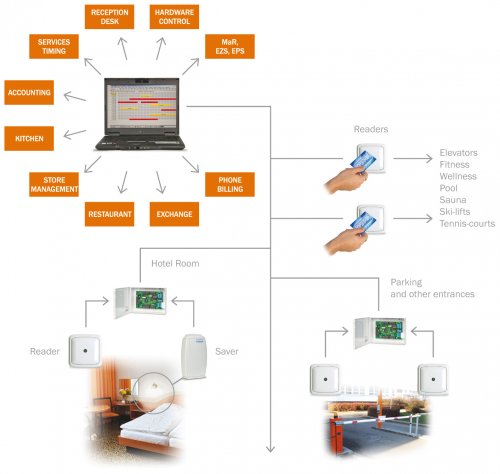 - Each place, where hotel card usage is to be recorded is equipped with card reader, which scans the card.